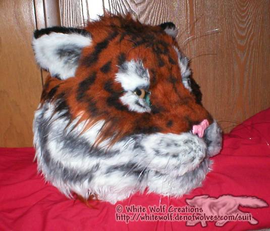 Fursuit head made for Cat.. aka Stalking Cat or Stalking Tiger. Realistic-like head made with taxidermy eyes and jaw set. Vision is through the 'tear ducts' of the eyes. Whiskers made with fishing line, and the stripes and shading were airbrushed.