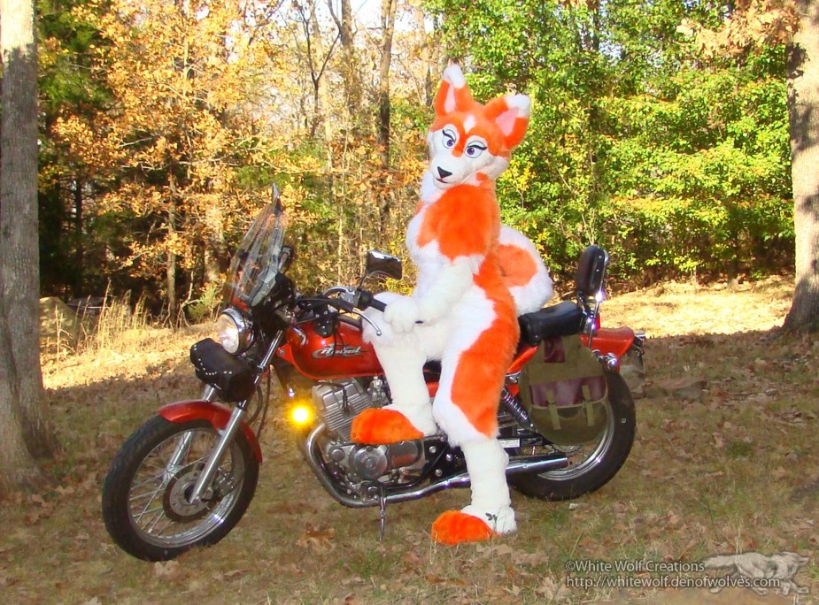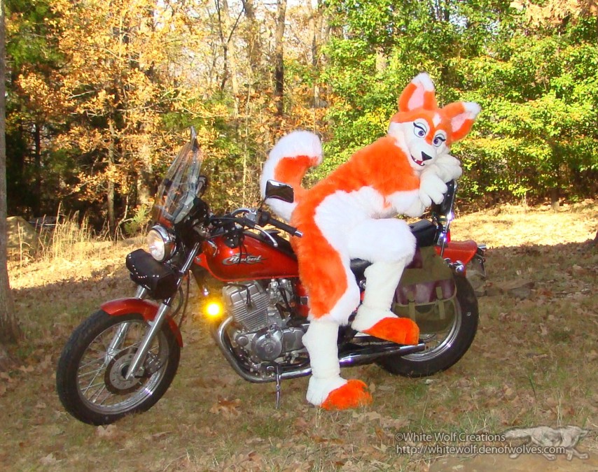 My latest personal suit! I wanted something orange, being one of my favorite colors. I kind of got attached to an orange husky avatar I was running around in for a little bit in second Life. And thus.. Chelsea was created. It's such a fun, bouncy character to run around in with the tail and all. Here I am posing on my Honda Rebel.