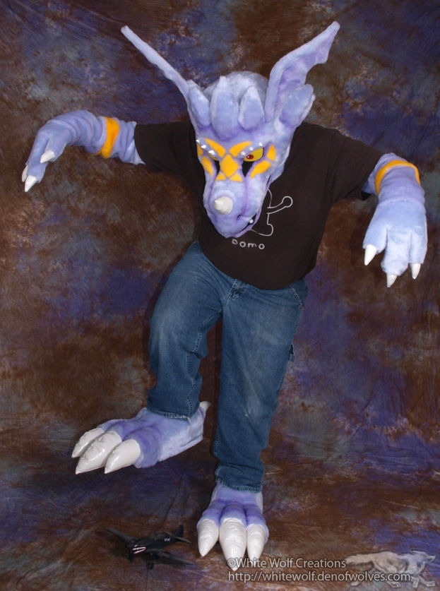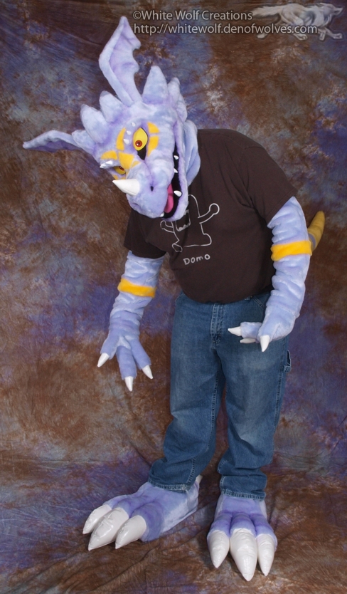 Fursuiting :: Dragoneer Suit It's a dragon! One of my most involved suits yet. Fins, spikes, and pokey-out teeth.. oh my! So much fun though. Short length seal fur used, with some airbrushing on the head. The smaller spikes are scuplted, while the horn is sewn so it would stay lightweight. |