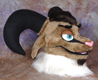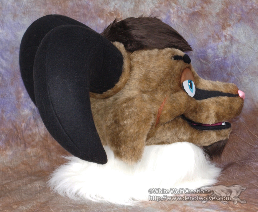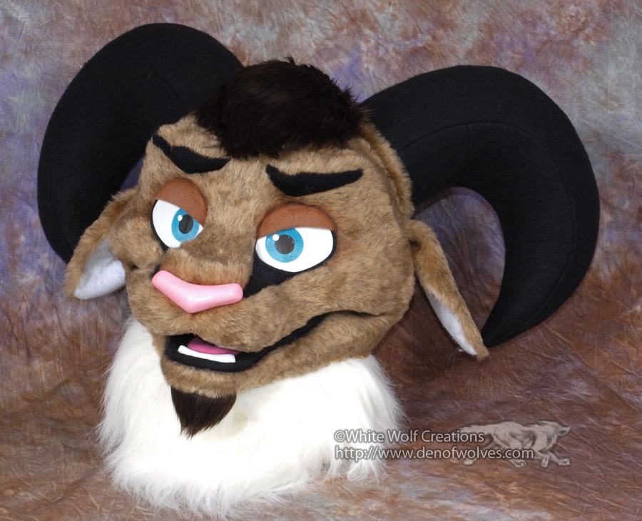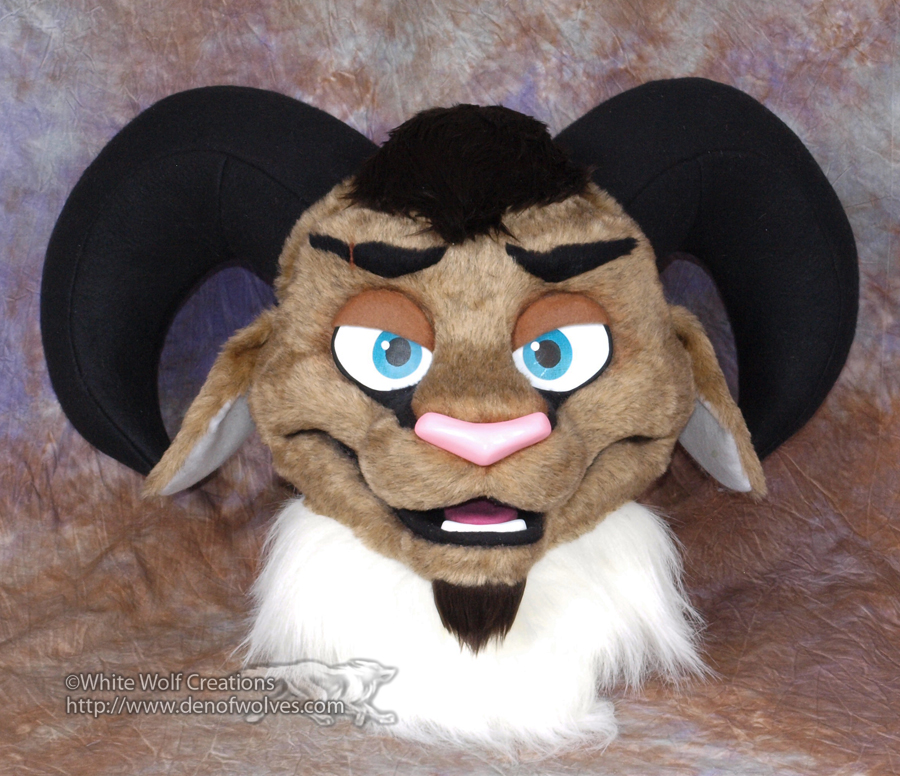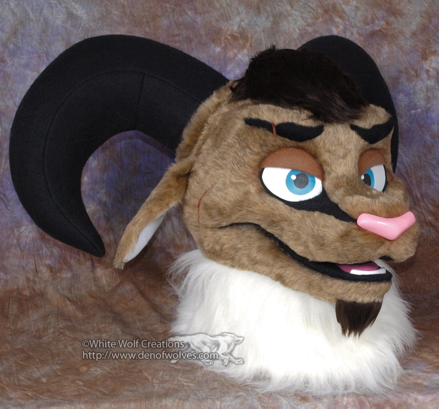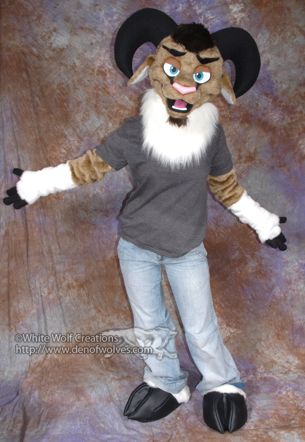 My first goat fursuit! Certainly happy with how he came out. Moving jaw, felt-covered horns per request of the commissioner. The markings on the right cheek and through the eyebrow are scars. This guy has felt fingers to match his horns, though for the feet I opted to go with a more durable vinyl.