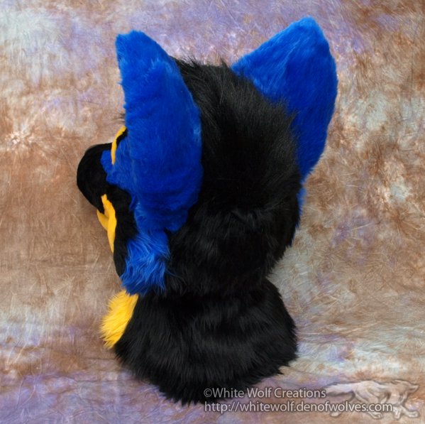 Concept art I drew for this neat-looking guy! This one was a lot of fun to work on. Unique colorations always keep the job interesting and moving along steadily, since I was so excited to see how it would turn out. Balaclava-based head with moving jaw. I made sure to use a different fur for the hair so it would stand out better from the other long pile black fur.
