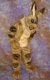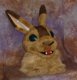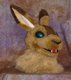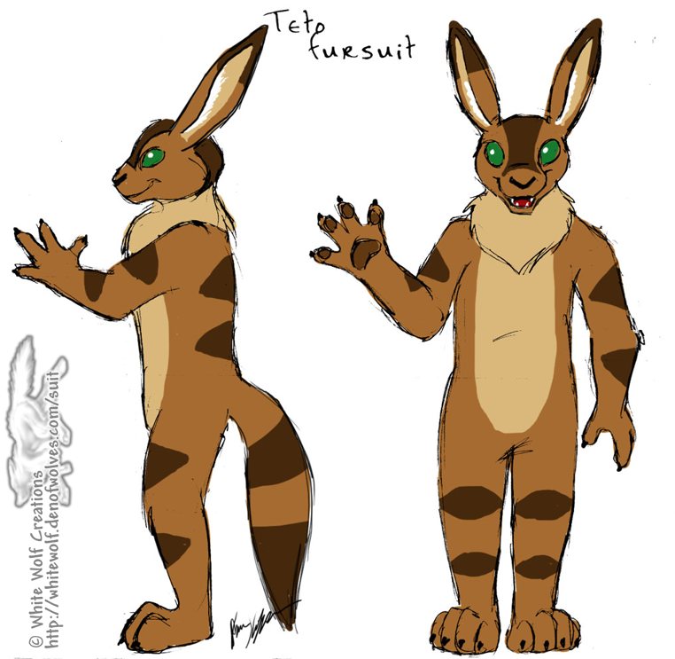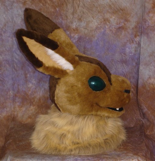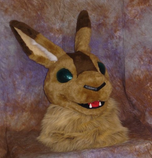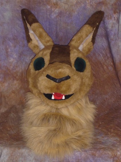 Quite the original little fellow! This is a fox-squirrel character, hence the bulgey squirrel-like eyes. He is balaclava based with a moving jaw. The head was made as small as possible, yet big enough to support the ears. The eyes are clear domes with stained-glass paint. The markings on this guy were large and simple enough to machine-sew into "holes" in the body suit, THANKFULLY! Hand-sewing can be quite tedious and time-consuming. :) I am wearing the suit here, and being a bit smaller than the owner, this is why he looks quite baggy on me. |